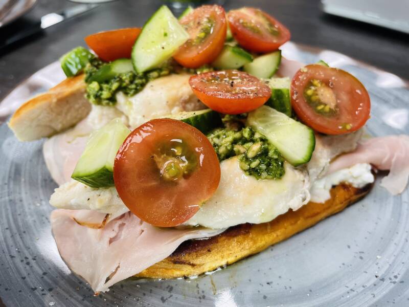 Top af met groene pesto, plakjes komkommer en tomaat.