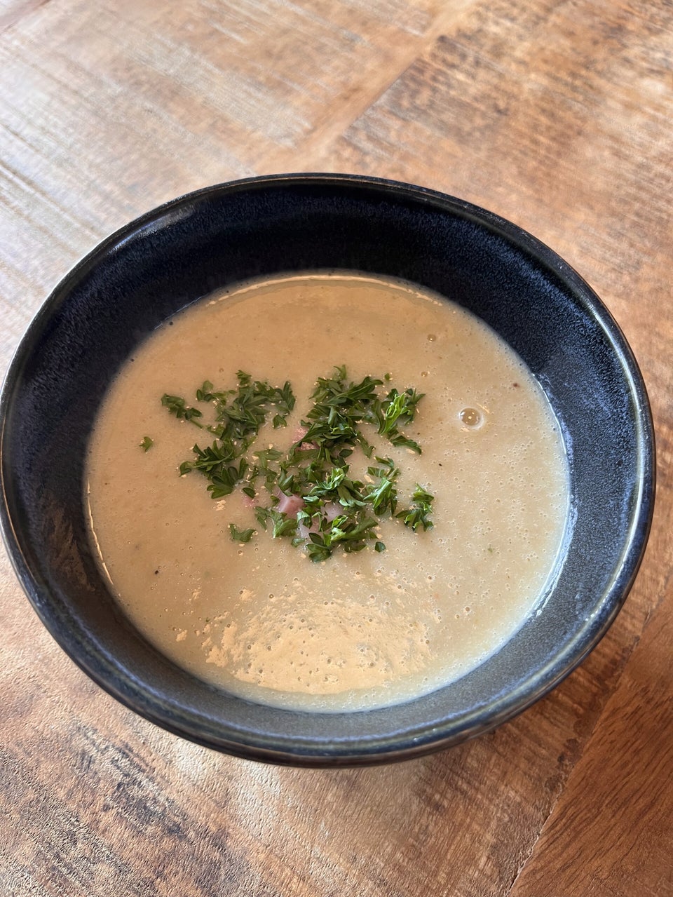 Voeg na 2 minuten de bloem toe en roer goed door. Voeg daarna de groentebouillon en de (haver)melk toe en breng het geheel aan de kook. Laat de soep ongeveer 8 minuten koken en pureer het geheel daarna met de staafmixer. Voeg de hamblokjes toe en verwarm de soep nog even kort, zodat de hamblokjes ook wat warmer worden. Serveer de soep in kommetjes, snijd de peterselie fijn en verdeel deze over de kommetjes.