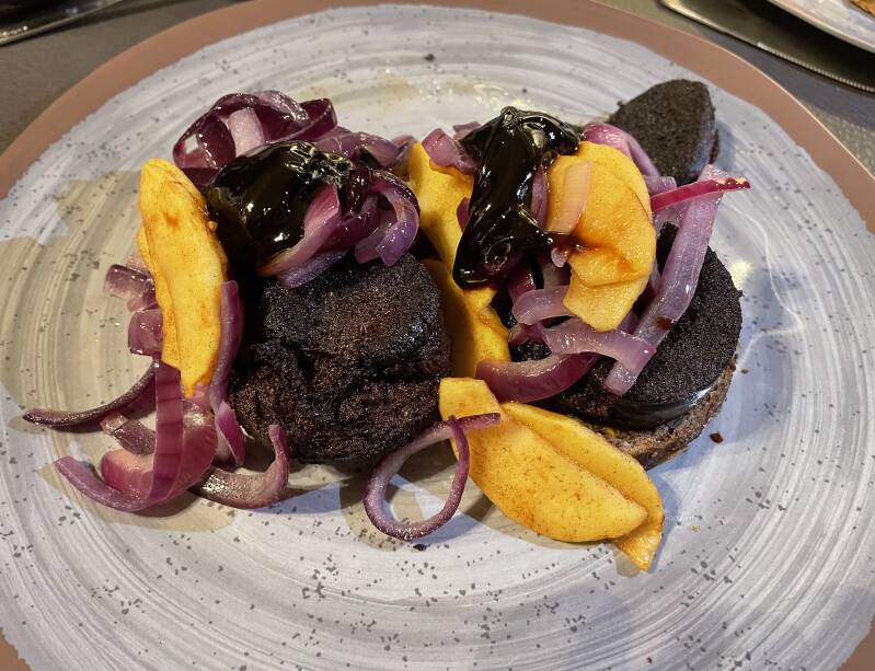 Leg de sneetjes brood op je bord en verdeel de plakken bloedworst, ui en appel erover. Top het af met de appelstroop. Smakelijk eten!