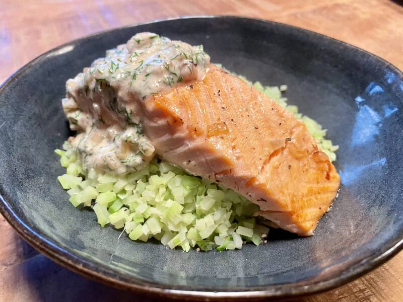Voeg de kookzuivel toe aan de pan, breng het geheel aan de kook en laat de saus inkoken. Voeg de dille, citroenrasp en citroensap toe en breng de saus op smaak met zout en peper.