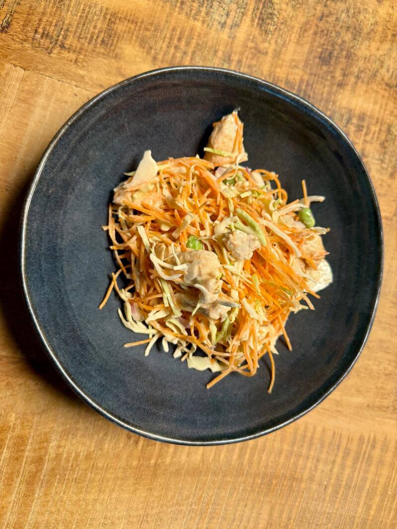 Kruid de kipstukjes met de paprikapoeder en zout. Spray olijfolie in een koekenpan en bak hierin de kipstukjes. Kook ondertussen de edamame boontjes zoals aangegeven op de verpakking en laat deze vervolgens afkoelen. Doe in een grote salade kom de Griekse yoghurt, remia friteslijn, wittewijn azijn, olijfolie, knoflookpoeder, gembersiroop, zout en peper. Meng deze ingrediënten goed door elkaar tot een mooie dressing. Voeg de kool, peen, rode ui, kip en edamame toe aan de dressing. Meng het goed door elkaar. Verdeel het over 2 kleinere kommen. Eet smakelijk!