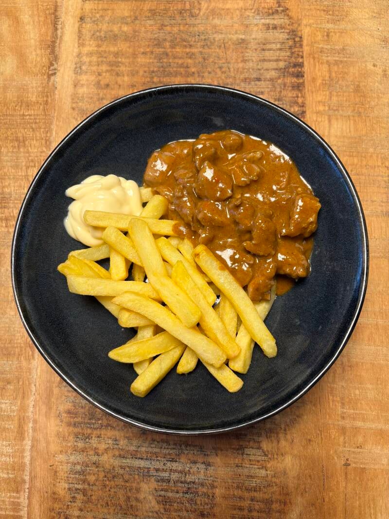 Snipper de rode ui en snijd de rode peper in stukjes. Verhit een pan met dikke bodem en verhit hier olijfspray in. Fruit de ui en de rode peper in de pan. Snijd de kipdijfilet in stukken en voeg deze toe in de pan. Bak rondom bruin. Voeg de rendangpasta toe en bak een paar minuten mee. Blus het geheel af met de kokosmelk en breng aan de kook. Hoe langer je het kookt, hoe lekkerder, maar in principe is het na 10 - 20 minuten gaar. Is de saus nog te dun? Voeg dan een maïzenapap toe en kook tot de gewenste dikte (1 el maïzena + 2 el kokosmelk). Bak ondertussen de friet zoals aangegeven op de verpakken, wij doen dit in de airfryer. Verdeel de friet en rendang over de twee borden. Als je wilt kun je er nog een klein dotje Remia friteslijn bij doen. Eet smakelijk!