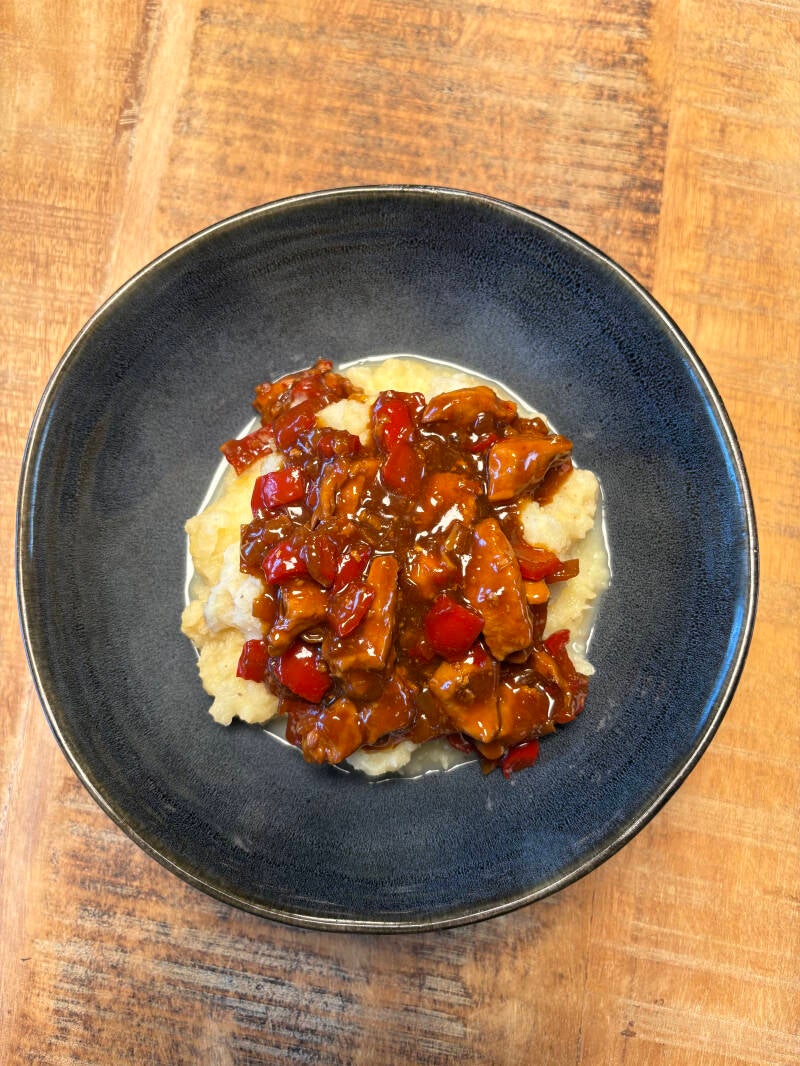 Zet een ruime pan met water op en breng dit aan de kook. Kook de aardappelen 13 minuten en doe dan de bloemkool er bij. Kook dit alles samen vervolgens nog eens 7 minuten. Snijd ondertussen de paprika, snipper de ui en hak de knoflook. Maak de saus van de sweet chili, ketjap Manis, sambal geleek, maizena/bloem en water. Roer dit goed door elkaar heen. Pak een pan, doe hier een 2x spray olijfolie in en fruit de ui en knoflook aan. Voeg de paprika toe en bak dit heel even. Voeg nu de kipfilet toe. Bak tot de kip gaar is. Voeg dan de saus toe, laat het even binden en dan is de hele kip klaar. Maak nu de stampot af. Giet de aardappelen en bloemkool af. Voeg de melk en de ongezouten roomboter toe. Stamp dit door elkaar heen. Breng op smaak met zout en peper. Doe eerst de stampot in een kommetje en doe hierover de hete kip, eet smakelijk!